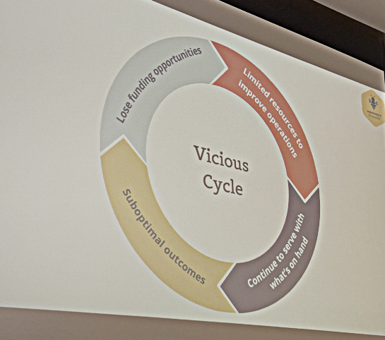 She introduced a framework that honestly stopped me in my tracks: the Vicious Cycle. It goes like this: nonprofits have limited resources to improve their operations, so they continue to serve with what's on hand, which leads to suboptimal outcomes, which causes them to lose funding opportunities — which leaves them with even fewer resources. And the cycle repeats.