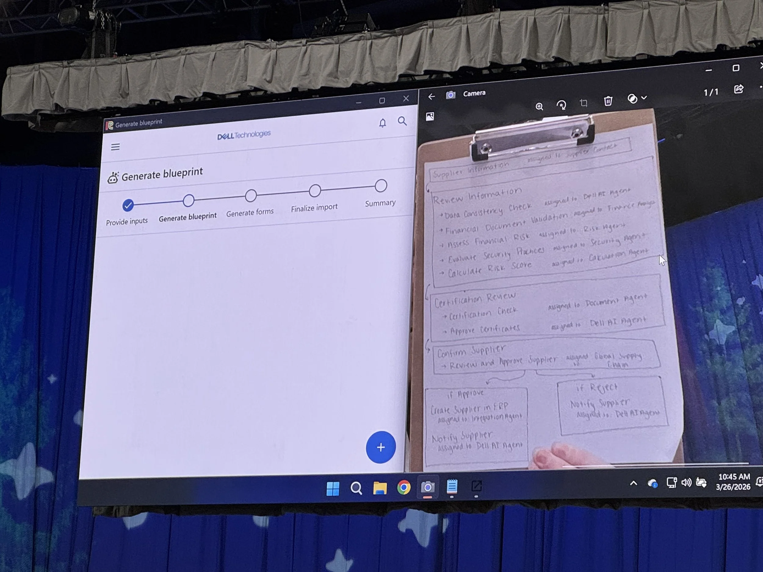 The clipboard shows a hand-drawn supplier onboarding flow — supplier information, financial document validation, risk assessment, certification review, approval and rejection branches. Beside it, the "Generate Blueprint" interface has already begun turning it into a structured workflow.